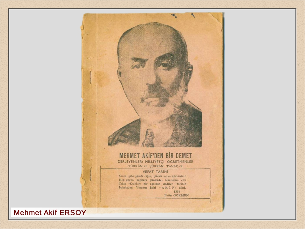 Akif'in Anısına Hazırlanmış Bir Kitap. Kapak Üzerindeki Şiir:"Mum gibi yandı ciğer, çünkü vatan türküsünü/ Hep geçen kapkara günlerde terennüm etti./ Çıktı (Kırklar) bir ağızdan dediler tarihin/ İçimizden Vatanın Şairi Akif gitti." (Safahat)
