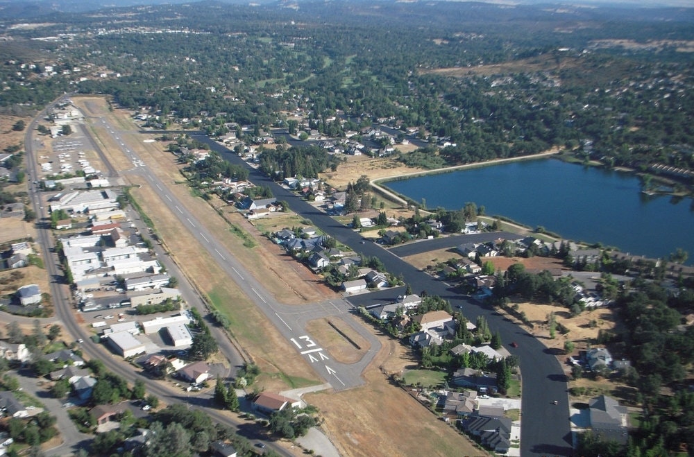 Cameron Park Havaalanı'nın (sol) ve konut caddesinin (sağ) bulunduğu görünüm. (Kaynak)