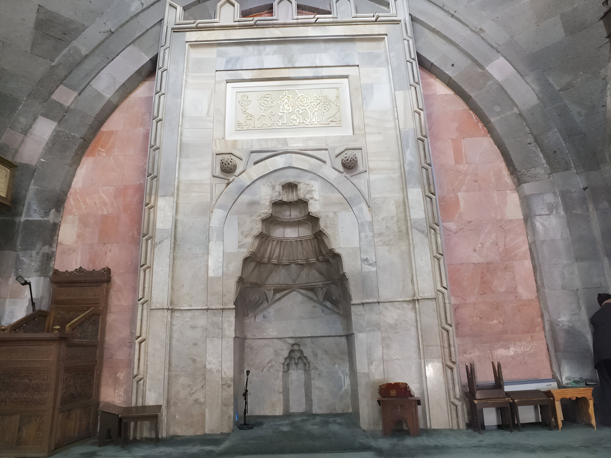 Caminin iç mekanında ayaklar ve sütunlar kemerlerle birbirine bağlanmıştır. Kısa eksene paralel kemerler ibadet alanını bölerken, güneydeki istinat noktalarını birleştiren kemerler uzun eksene paraleldir. Tavan, 30-50 cm çapında çam kirişler ile desteklenmiş, üzeri kamış çit ve eskiden toprak, günümüzde ise beton bir örtüyle kaplanmıştır. Yağmur sularının akması için tavanın meyili, örtünün kalınlık farkıyla sağlanmıştır. Dış duvarlara yerleştirilen taş oluklar ise su tahliyesini kolaylaştırır.