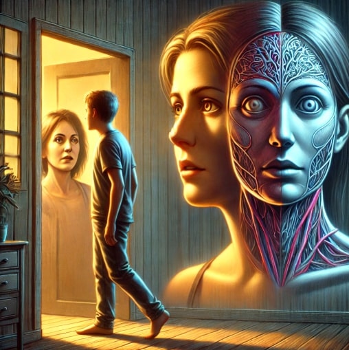 (Capgras sendromunun, gerçekçi ve yabancılaşmış bir "anne" figürünü aynı anda gösteren, hasta bireyin karmaşık duygularını vurgulayan bir sahne). Yapay zeka ile tasarlanmıştır.