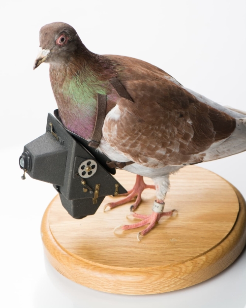 Görüntü toplamak üzere yetiştirilmiş ve kamera bağlanmış bir güvercin. (Spy Museum)