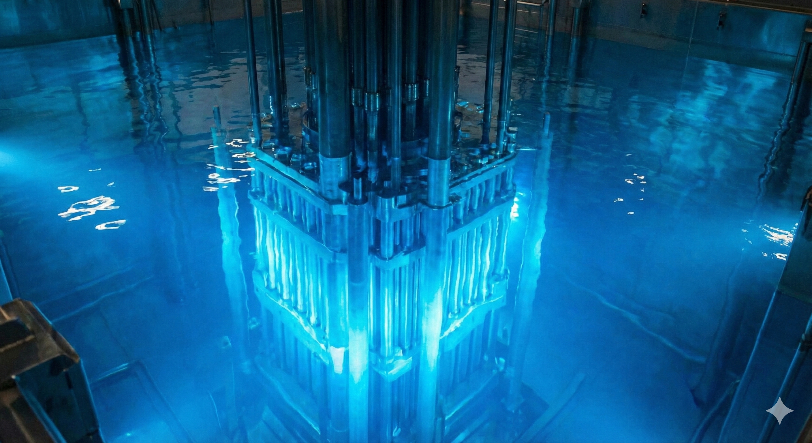 Nükleer yakıttan yayılan yüklü parçacıkların, su içerisinde ışık hızını aşması sonucu yaydığı mavi-mor renkteki Çerenkov ışıması (Yapay Zeka ile oluşturulmuştur.)