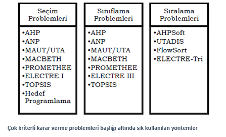 Yukarıdaki görselde yer aldığı üzere seçim, sıralama ve sınıflama problemlerinde çeşitli karar verme teknikleri kullanılmaktadır. Genellikle çalışmalara bakıldığında en çok tercih edilen yöntemler arasında AHP, TOPSIS ve ELECTRE yer almaktadır.
