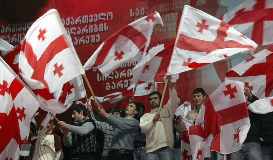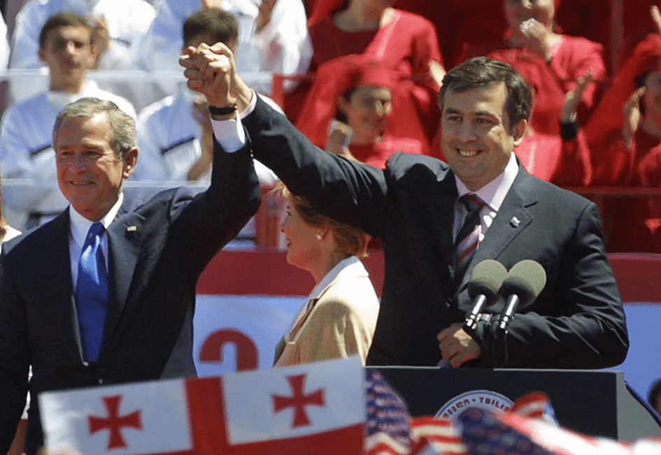 US President George W. Bush with Mikhail Saakashvili in the central square of the Georgian capital Tbilisi in May 2005 (Source: STR/AFP)
