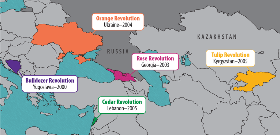 Color revolutions refer to the mass movements of the 2000s, primarily in the post-Soviet region, that aimed to counter authoritarian regimes through peaceful means. These movements were significantly influenced by the international context of the time. Following the collapse of the Soviet Union in the 1990s, Russia was undergoing a prolonged period of economic and political recovery. The Western world sought to leverage this opportunity to expand democratic values and market economies. The United States and the European Union, in particular, increased their economic and civil society support in the region.