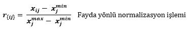 Normalize Etme: Karar matrisi, farklı ölçü birimlerine sahip kriterlerin karşılaştırılabilmesi için normalize edilir. Genellikle min-max yöntemi kullanılır.