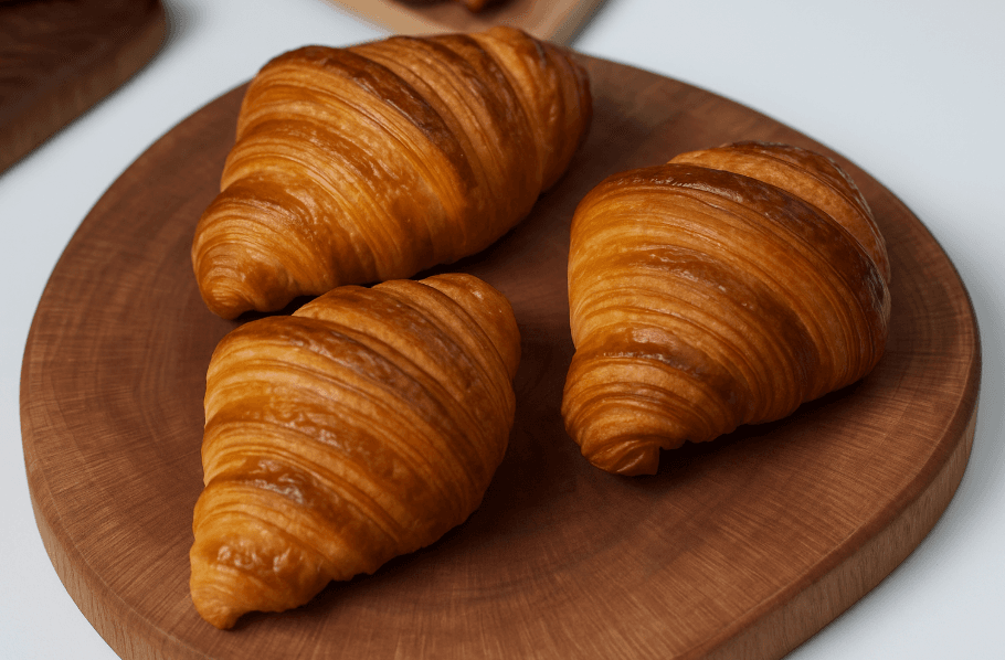 The croissant (French: croissant) is a baked product made from a layered, yeasted, and buttery dough. It is characterized by its crisp exterior and soft, airy interior. Croissants are typically prepared in a crescent shape. The generous use of butter and the specialized folding and rolling techniques used in preparing the dough result in a flaky texture that separates into layers when baked. Croissants can be consumed plain or filled with ingredients such as chocolate, almond paste, or other fillings.