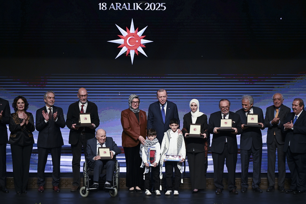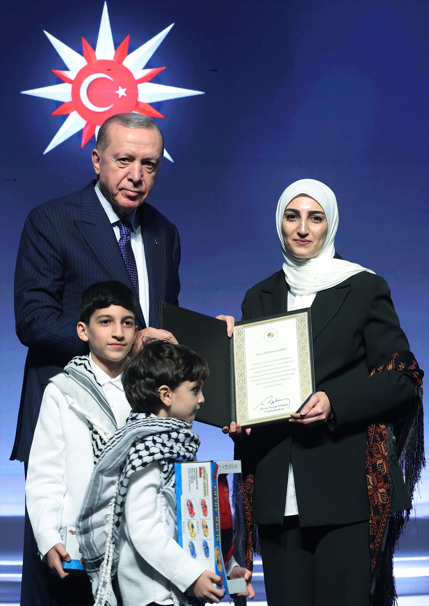 Cumhurbaşkanı Erdoğan, fotoğraf kategorisinde ödüle layık görülen Anadolu Ajansı (AA) Foto Muhabiri Ali Jadallah'ın ödülünü eşi Doaa İsavi ve çocuklarına veriyor, 18 Aralık 2025 - (Anadolu Ajansı)
