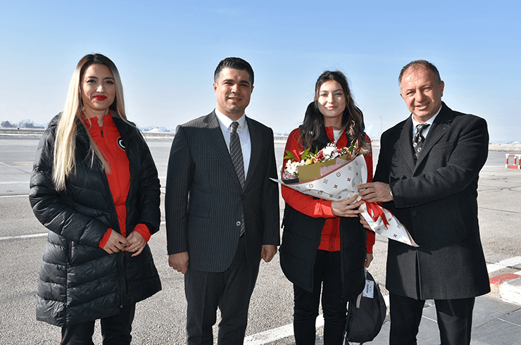 Gençlik ve Spor İl Müdürü Levent Çakmur, Spor Hizmetleri Müdürü Erdoğan Dönmez ve sporcular, Damla'yı çiçekle karşıladı. (AA)