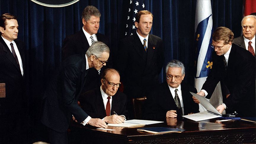 Bosna-Hersek, Hırvatistan ve Yugoslavya Federal Cumhuriyeti temsilcileri ABD’nin Ohio eyaletindeki Wright-Patterson Hava Üssü’nde müzakerelere katılmıştır. Ateşkes hükümleri kalıcı barış çerçevesine dönüştürülmüş ve antlaşma, Bosna-Hersek’in uluslararası tanınmış sınırları içinde varlığını sürdüren bir devlet olarak yeniden yapılandırılmasını öngörmüştür.