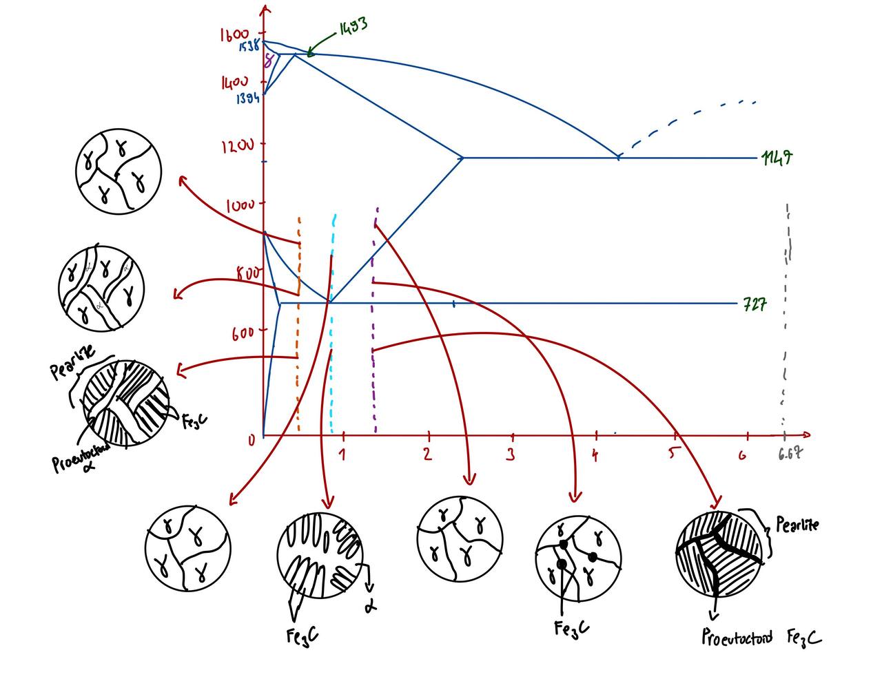 - Peritektik Nokta: 0.16 wt.% C bileşiminde ve 1493 °C sıcaklıkta, δ-ferrit ve sıvı fazın austenite dönüşümüyle gerçekleşir: