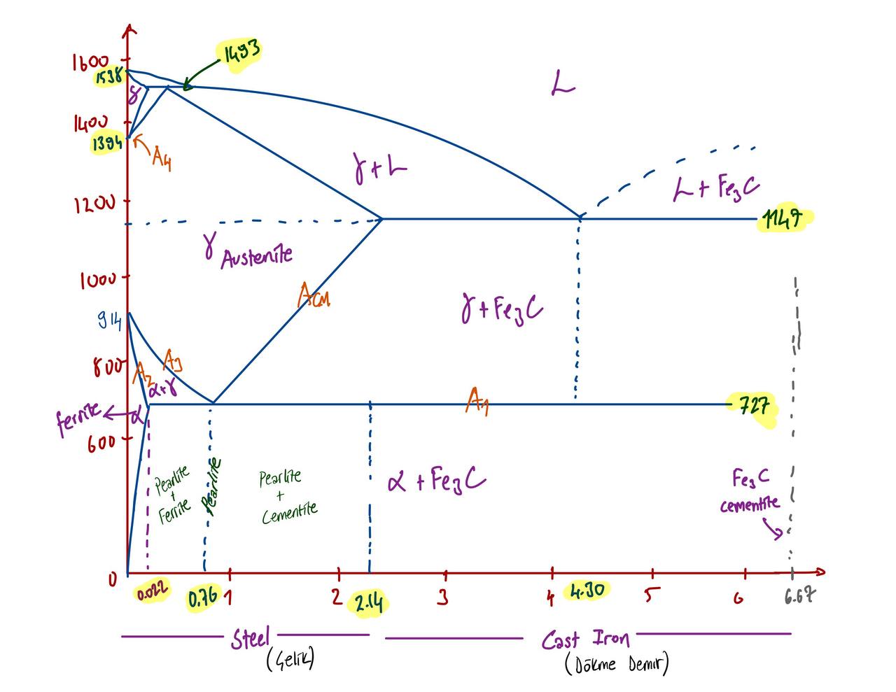 Temsili Fe-C (Demir- Karbon) Denge Diyagramı Gösterimi. (Kritik sıcaklıklar ve karbon yüzdeleri sarı renkle vurgulanmıştır.) (Görsel: Muzaffer Yalçın)