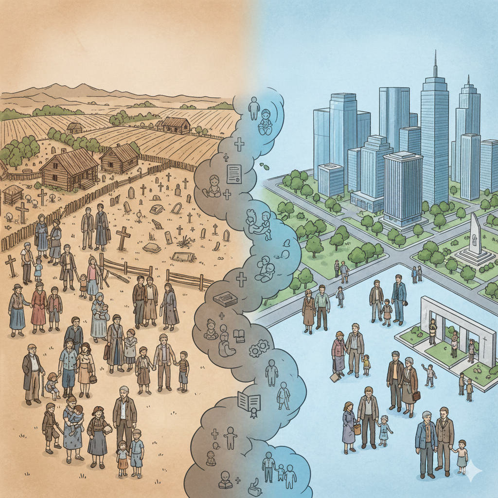 Demografik Geçiş: Köyden Kente Yaşamın Dönüşümü (Yapay Zeka İle Oluşturulmuştur)
