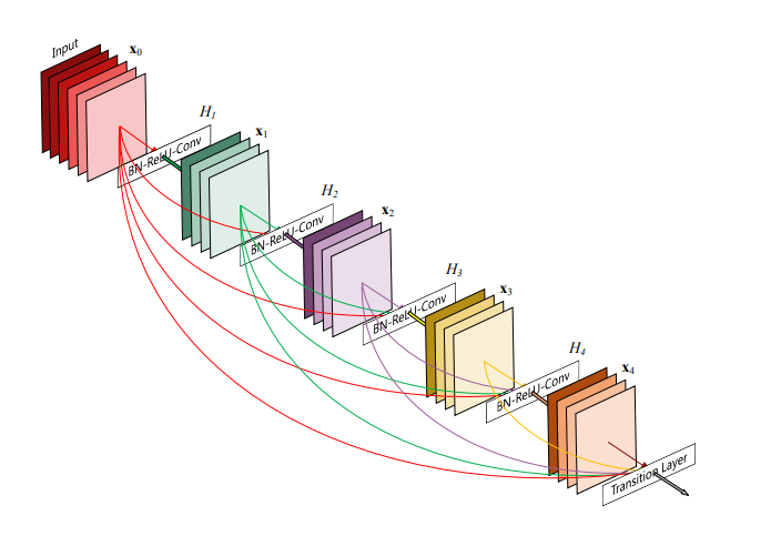 DenseNet mimarisinde her katman, kendisinden önceki tüm katmanların çıktısını giriş olarak alır. Bu yaklaşım, klasik sinir ağlarının aksine, bilgi kaybını azaltır ve özelliklerin yeniden kullanımını sağlar.