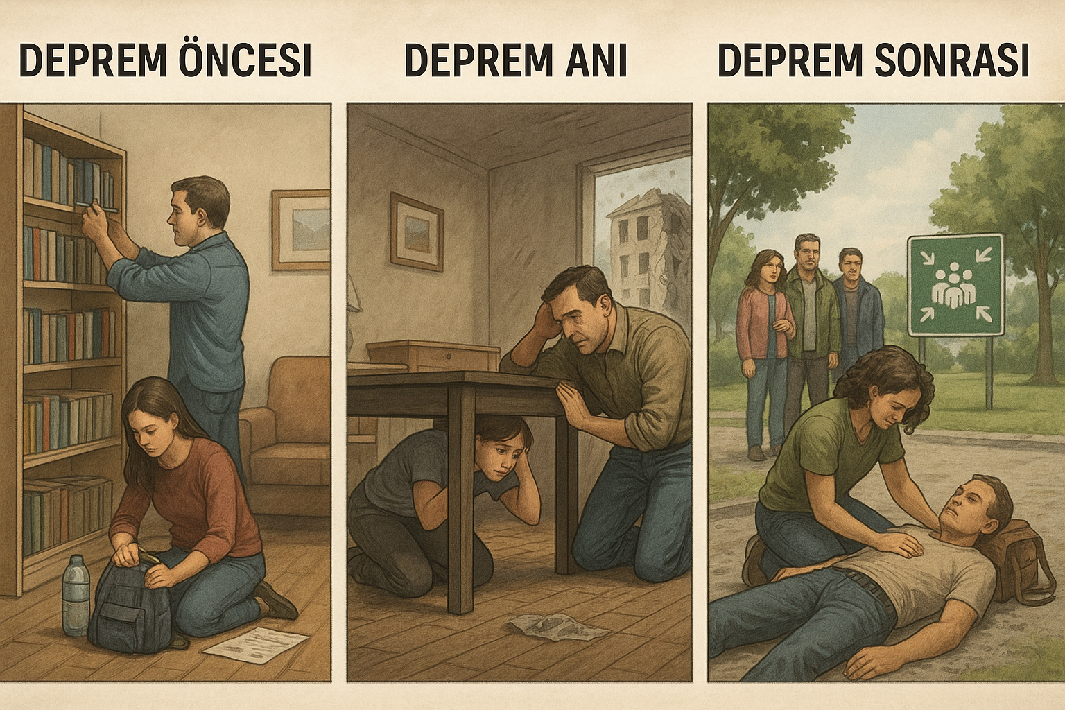 Deprem anında doğru davranışların öğrenilmesi için düzenli aralıklarla tatbikat yapılmalı, afet bilinci eğitimleri alınmalıdır.