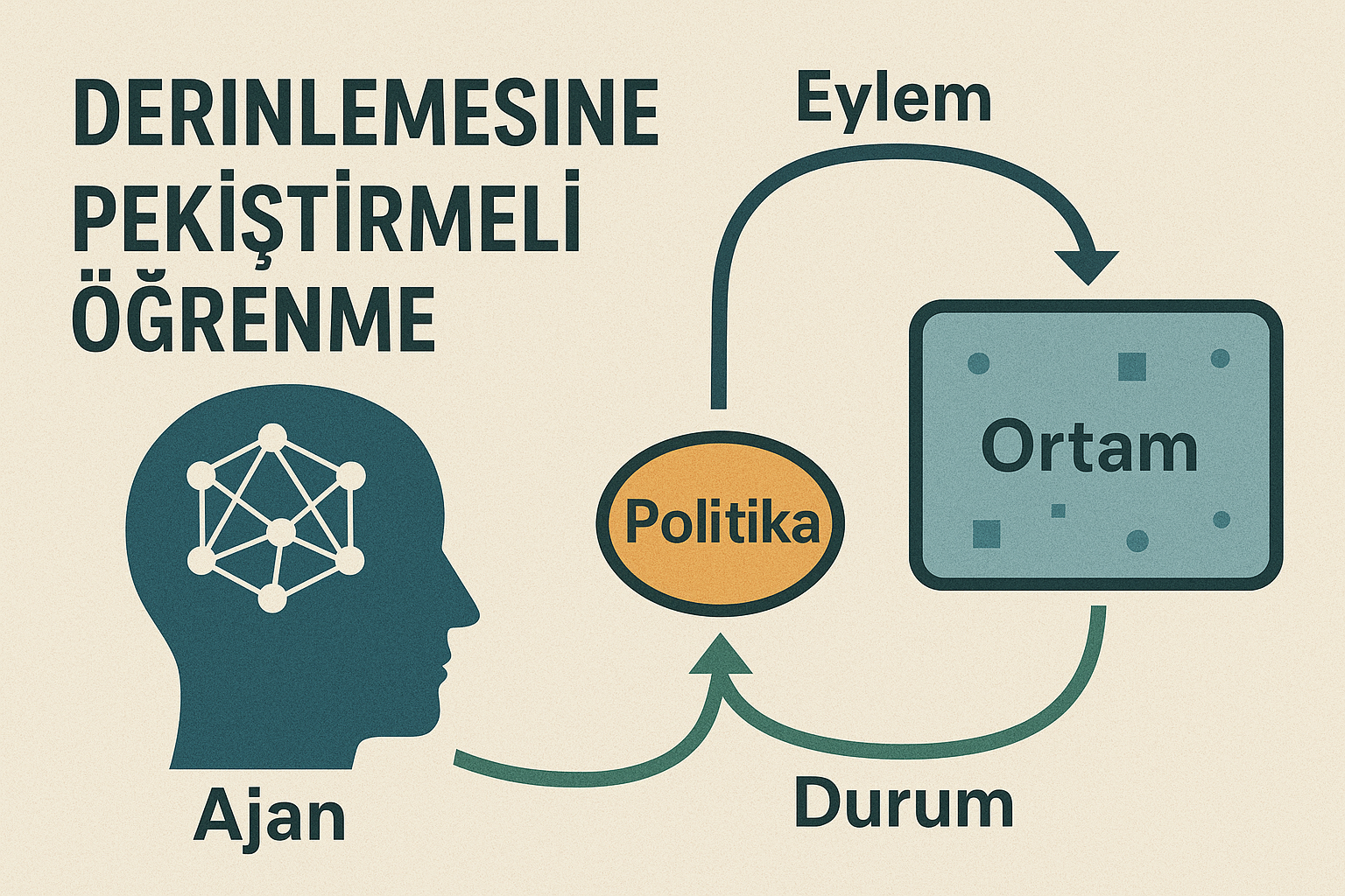 Derinlemesine pekiştirmeli öğrenmenin temel bileşenlerini gösteren temsili bir diyagram