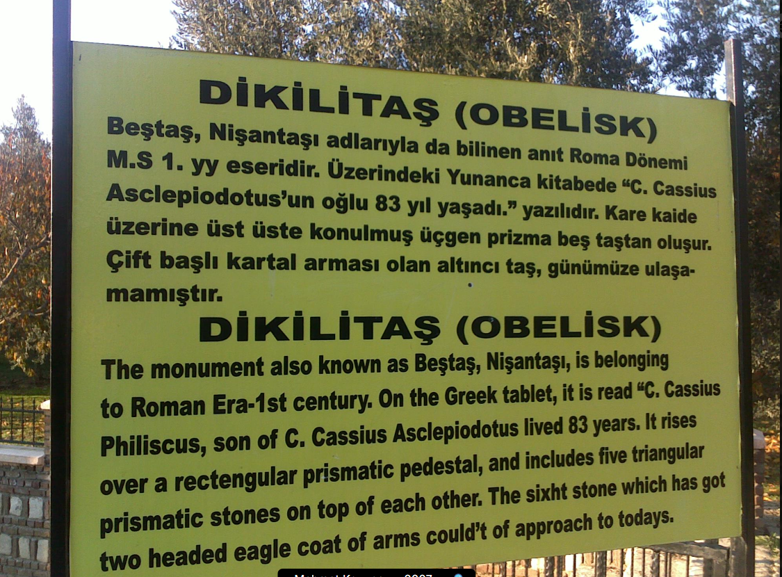 Kaynaklarda yer alan bilgilere göre Dikilitaş, Roma İmparatorluğu’nun Anadolu’daki egemenliği sırasında, II. yüzyılda inşa edilmiştir. Anıtın, Asklepiodos’un oğlu L. Cassius Philiscus adına dikildiği belirtilmektedir. Bu durum, yapının bir anma ve mezar anıtı olduğunu ortaya koymaktadır. Roma döneminde bu tür anıtlar, hem bireyin toplumsal statüsünü vurgulamak hem de hatırasını kalıcı kılmak amacıyla inşa edilmiştir.