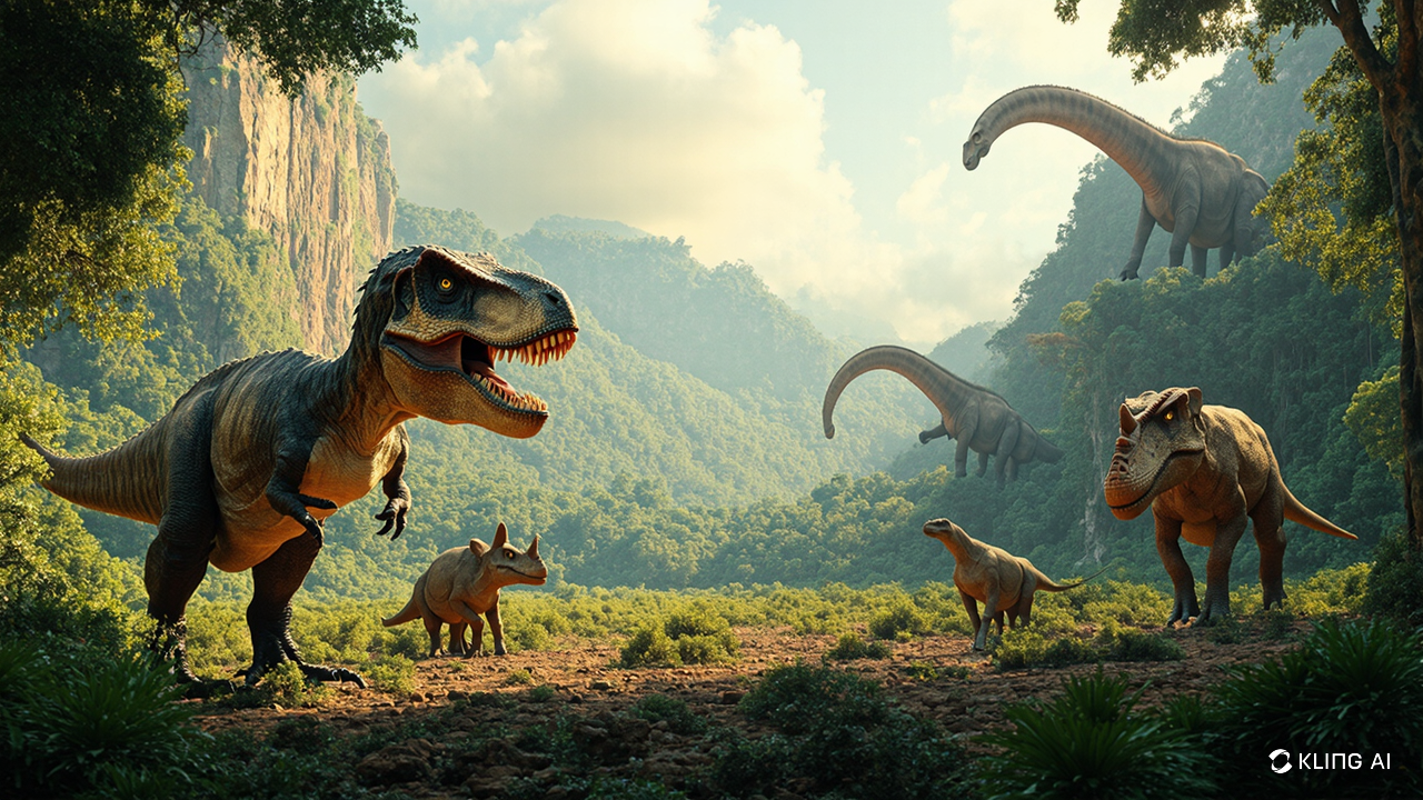 Dinozor türlerini tasvir eden bir görsel. Yapay zeka ile üretilmiştir.