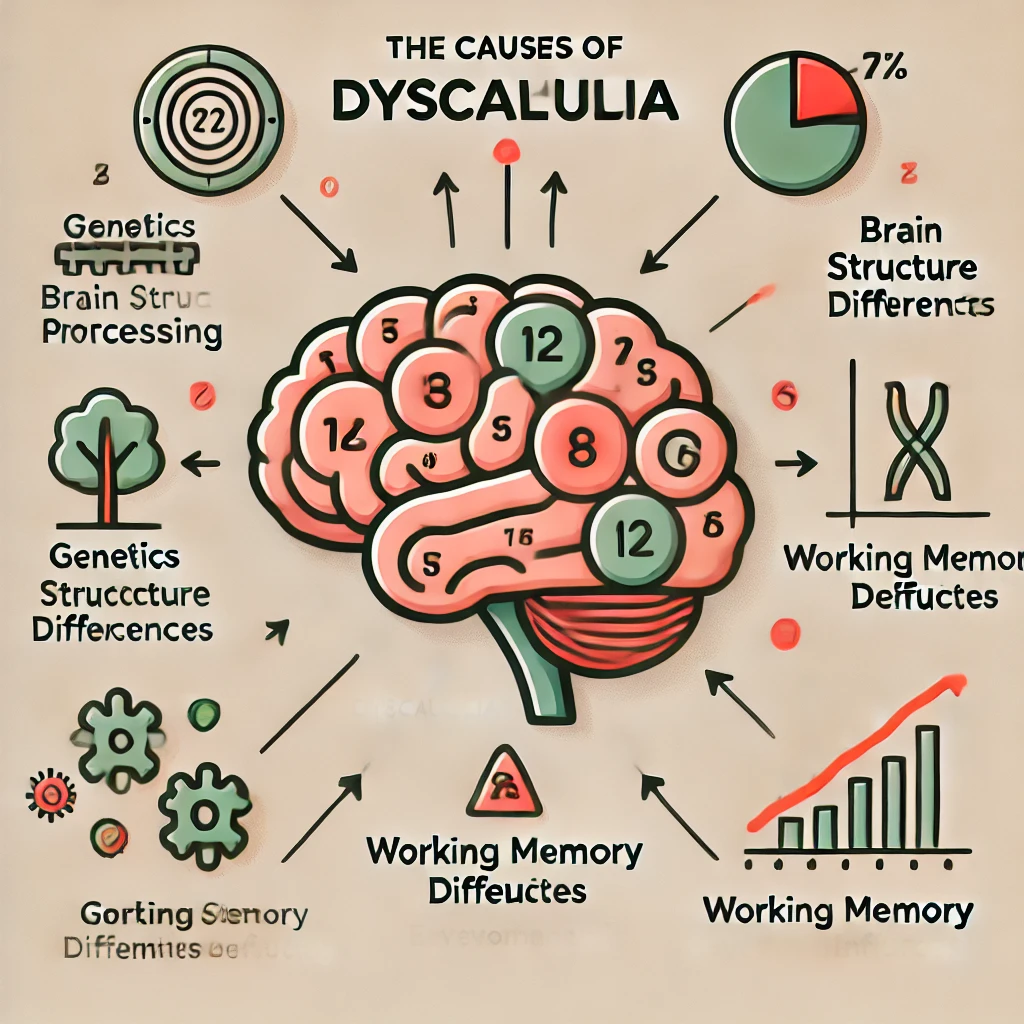 Her ne kadar zihinsel yetersizlik ve yetersiz matematik eğitimi ile ilişkilendirilse de, normal zeka seviyesindeki bireylerde çevresel nedenlere bağlı olarak matematik öğrenme güçlüğü yaşanabilir. Ancak, matematik öğrenme güçlüğü de yalnızca çevresel etkilerle açıklanamaz. Bu, kendi başına özgül bir öğrenme güçlüğü alanıdır. Bu nedenle, diskalkuli zihinsel yetersizlik veya düşük başarıdan farklı bir durum olup zihinsel yetersizlik ya da yetersiz eğitimle açıklanamaz. Psikolojik ve genetik faktörler de bu öğrenme güçlüğünde etkili olan meselelerdir.【2】
