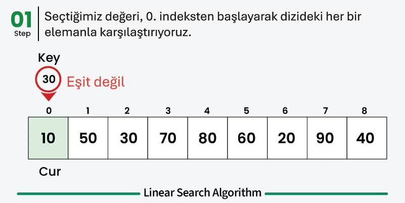 Doğrusal Arama Adım 1 (Kaynak: www.geeksforgeeks.org)