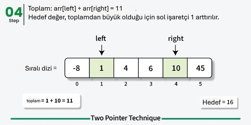 İki İşaretçi Tekniği Adım 4 (Kaynak: www.geeksforgeeks.org)
