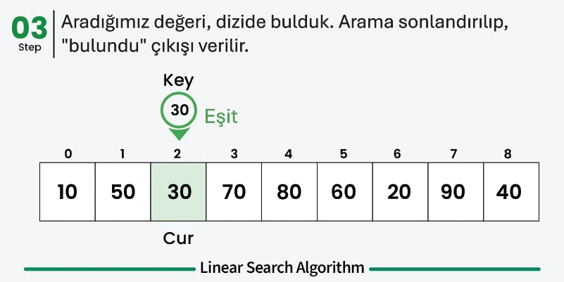 #includeusing namespace std; int linearSearch(int arr[], int size, int target) { for (int i = 0; i < size; i++) { // sırasıyla bütün dizi dolaşılır. if (arr[i] == target) return i; // Elemanın bulunduğu indeks } return -1; // Eleman bulunamadı } int main() { int arr[] = {10, 20, 30, 40, 50}; int size = sizeof(arr) / sizeof(arr[0]); int target = 30; int result = linearSearch(arr, size, target); if (result != -1) cout << "Eleman bulundu. Indeks: " << result << endl; else cout << "Eleman bulunamadi." << endl; return 0; }