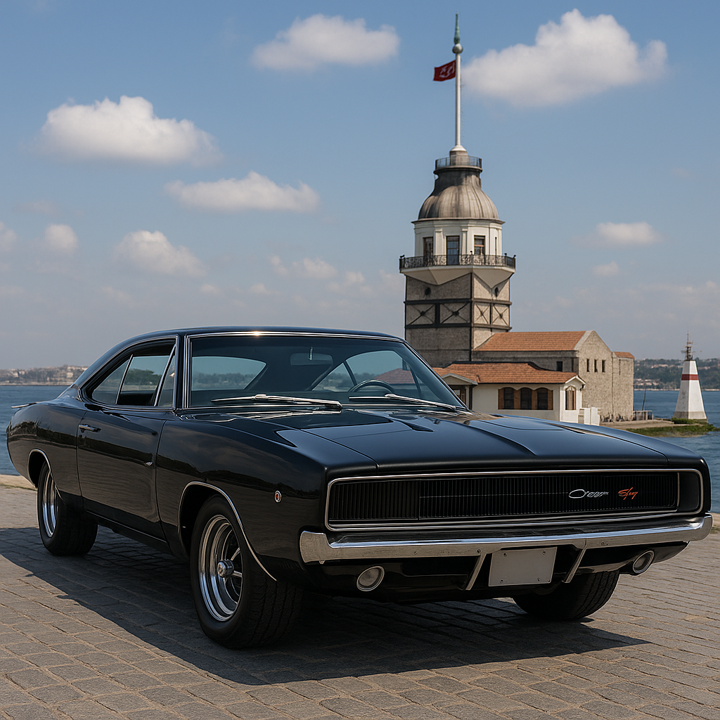 1968 Dodge Charger Kız Kulesi Önünde (Yapay zeka ile oluşturulmuştur)