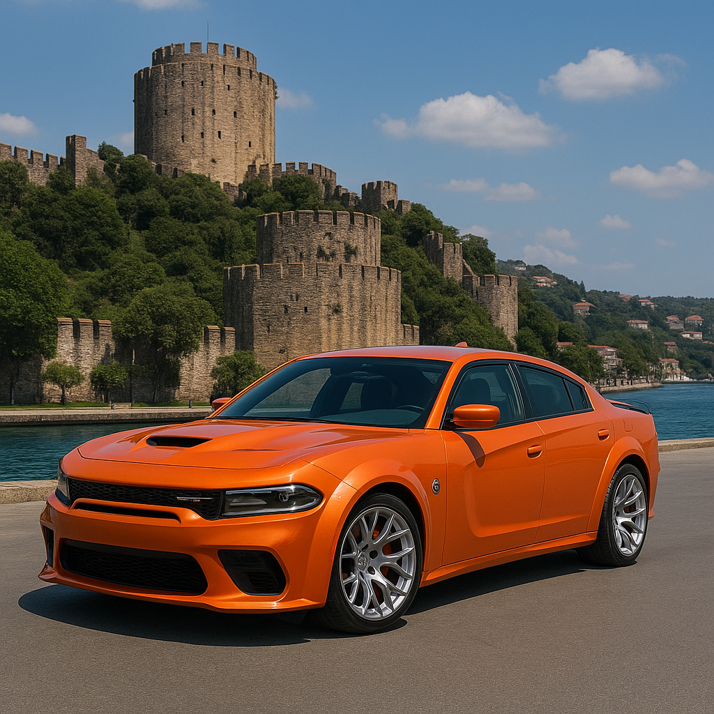 2023 Dodge Charger Rumeli Hisarı Önünde (Yapay zeka ile oluşturulmuştur)