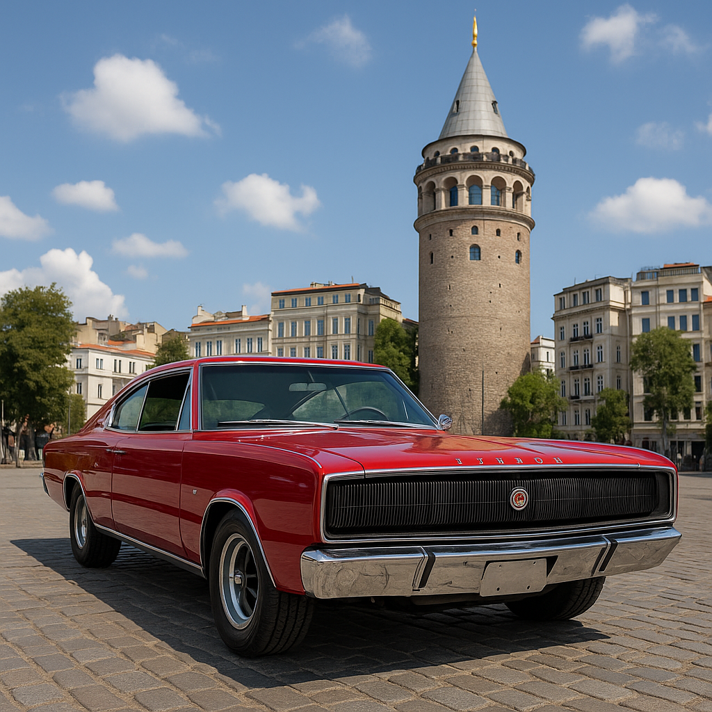 1966 Dodge Charger Galata Kulesi Önünde (Yapay zeka ile oluşturulmuştur)