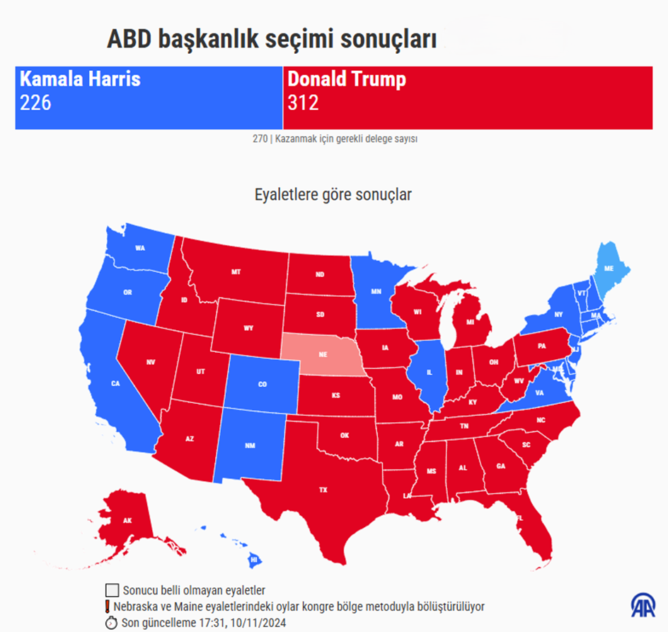 2024 ABD başkanlık seçimlerinde Donald Trump, toplam oyların %49,9’unu alarak ve 312 seçim delegesi kazanarak ikinci kez başkan seçilmiştir. Rakibi Kamala Harris ise %48,4 oy oranında kalmıştır. Seçim süreci boyunca Trump'ın kampanya stratejisi, Cumhuriyetçi tabanı sağlamlaştırmaya ve özellikle belirli demografik gruplarda oy oranını artırmaya odaklanmıştır.
