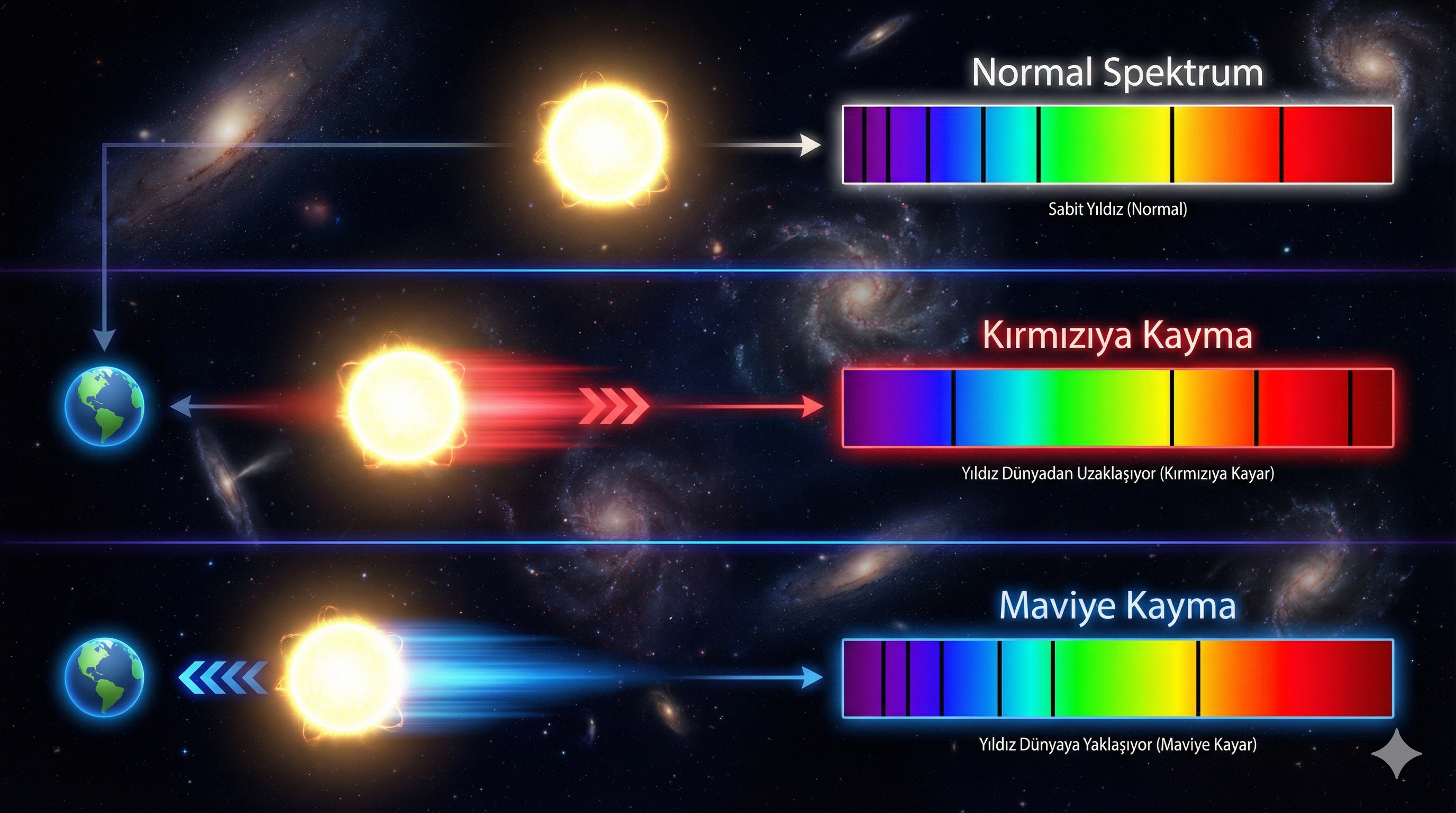 Yıldızların Dünyaya Göre Hareketine Bağlı Olarak Işık Spektrumundaki Çizgilerin Kırmızıya Veya Maviye Kaymasını Karşılaştıran Astronomik İnfografik (Yapay Zeka İle Oluşturmuştur.)