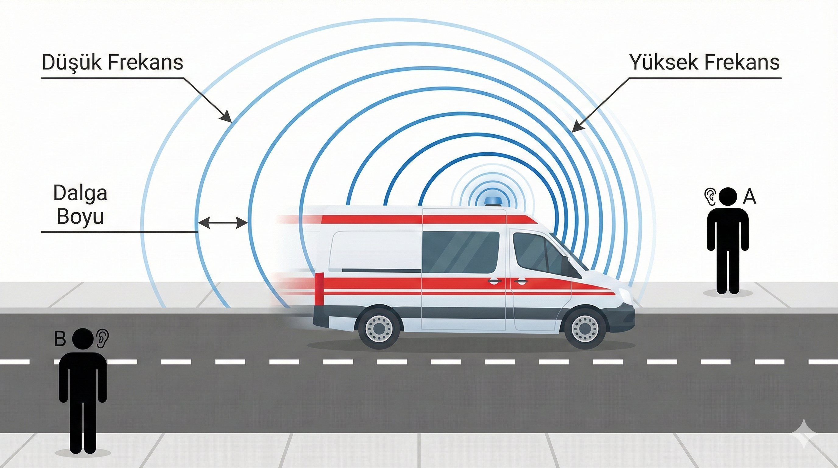 Hareketli Ambulansın Hızına Bağlı Olarak Ses Dalgalarının Ön Tarafta Sıkışmasını Ve Arka Tarafta Genişlemesini Gösteren Temel Doppler Etkisi İllüstrasyonu (Yapay Zeka İle Oluşturulmuştur.)
