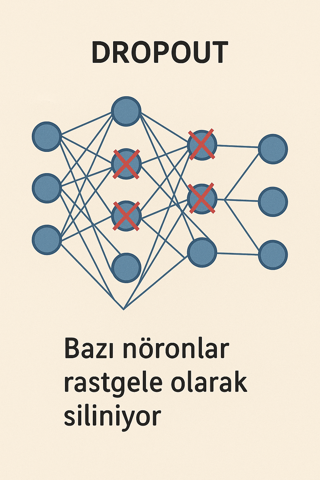 Dropout çalışma prensibi tasviri (Yapay Zekâ ile oluşturulmuştur)