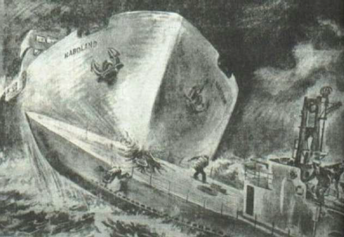 Saat 02.10 sularında, Dumlupınar denizaltısı ile Naboland şilebi Nara Burnu açıklarında karşı karşıya geldi. Şilep, Dumlupınar’a baş torpido dairesinin sancak tarafından çarptı. Bu çarpışma, baş kısmı oldukça zayıf olan denizaltı için yıkıcı etki yaratmış ve geminin hızla su almaya başlamasına neden olmuştur. Naboland’ın ön kısmında da ciddi bir hasar oluşmuş ancak mürettebatı zarar görmemiştir. Dumlupınar mürettebatı ise gemi içinde ve su yüzeyinde farklı noktalarda dağılmış hâlde kalmıştır.