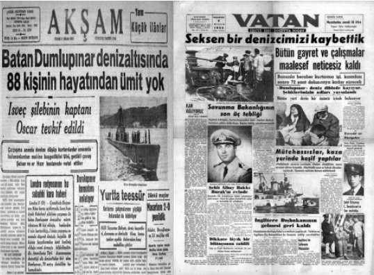 Basın organları, kazanın hemen ardından olay yerinden gelişmeleri gün gün aktarmış; özellikle telefon şamandırası aracılığıyla içerideki mürettebatla kurulan kısa süreli iletişim, manşet haberlerin temel malzemesi olmuştur. Mürettebattan Astsubay Selami Özben’in söylediği “Vatan sağ olsun” ifadesi, haber başlıklarında ve yorum köşelerinde sıkça kullanılmış, bu söz olayın sembolü hâline gelmiştir.