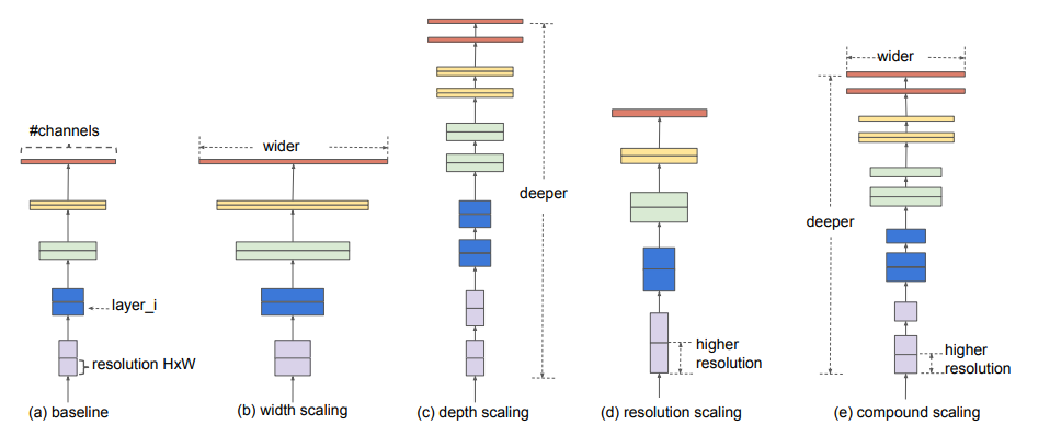 Bu eşitlikte, ölçekleme katsayısıdır ve sabit katsayılardır. Böylece model gereksinimlerine göre kontrollü biçimde büyütülebilir. Derinlik daha fazla katman, genişlik her katmandaki filtre sayısı ve çözünürlük ise giriş görüntüsünün boyutunun artırılması anlamına gelir.