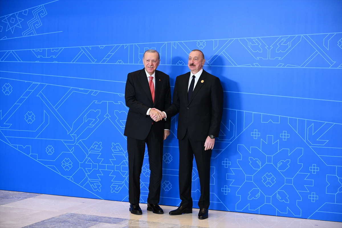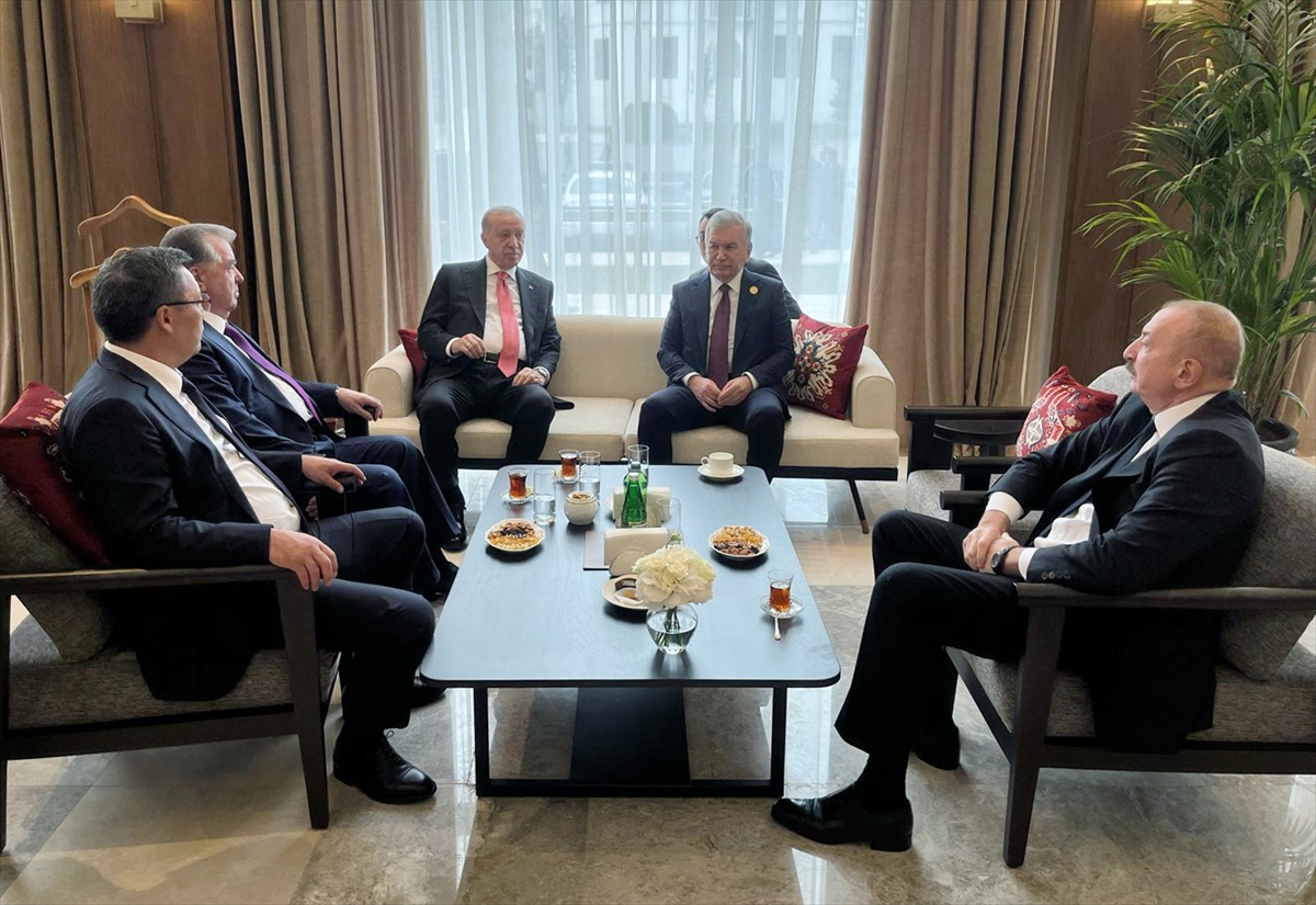 Cumhurbaşkanı Recep Tayyip Erdoğan, Ekonomik İşbirliği Teşkilatı 17. Zirvesi'ne Katılmak Üzere Geldiği Azerbaycan'ın Hankendi Şehrinde, Azerbaycan Cumhurbaşkanı İlham Aliyev ve Özbekistan Cumhurbaşkanı Şevket Mirziyoyev ile Bir Arada, 4 Temmuz 2025 - (Anadolu Ajansı)