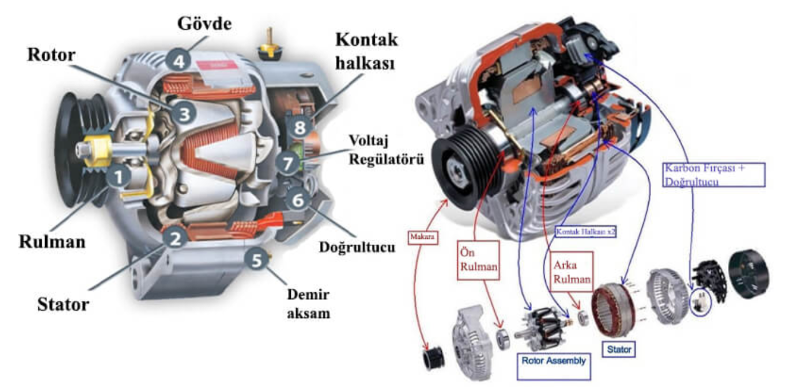 - Bu manyetik alan içinde yer alan iletken bobinler (çoğunlukla stator ya da rotor üzerinde) hareket ettirilir.