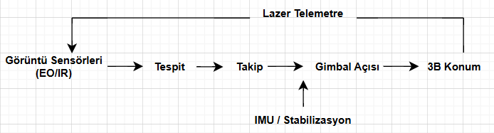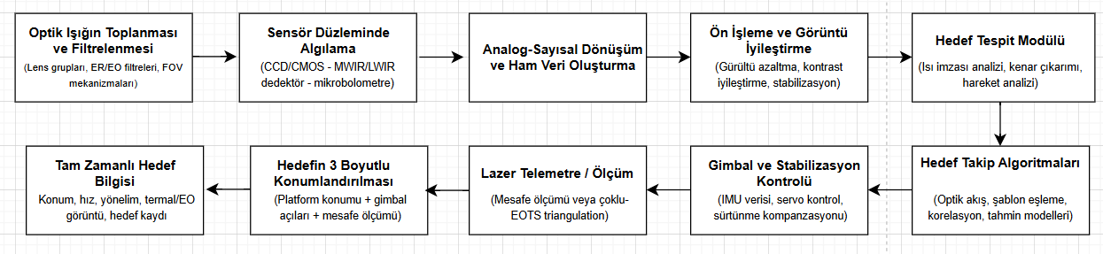 Elektro optik hedefleme sistemlerinde hedef tespiti, takibi ve konumlandırması, optik verinin fiziksel elde edilmesinden sayısal işlenmesine, görüntü tabanlı analizden geometrik konum çözümüne kadar uzanan çok aşamalı bir sürecin sonucudur. Bu süreç, sensörlerin sağladığı ham görüntünün işlenmesiyle başlar; hedefin sahne içerisindeki konumunun belirlenmesi, zamansal sürekliliğinin korunması ve nihayetinde iki boyutlu görüntü koordinatlarının üç boyutlu uzaysal koordinatlara dönüştürülmesiyle devam eder. Her aşama, elektro optik sistemin görev performansını doğrudan etkilediğinden yüksek doğruluk, kararlılık ve gerçek zamanlılık gereksinimleriyle yürütülür.