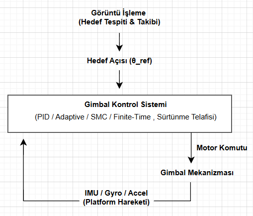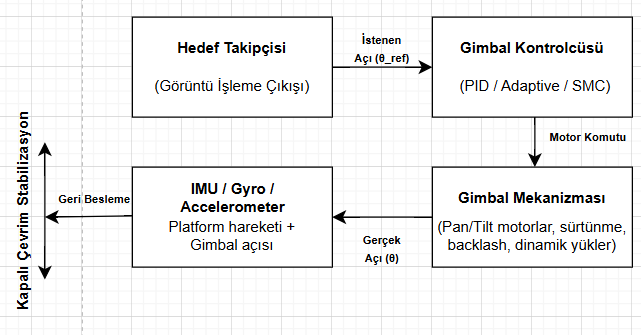 Tüm bu kontrol ve stabilizasyon mekanizmaları, görüntü işleme bölümünde yapılan hedef takibiyle entegre çalışır. Görüntü işleme algoritmaları hedefin kareler arasındaki konumunu belirlerken, kontrol sistemi bu hedefi merkezde tutacak şekilde gimbal eksenlerini sürekli olarak ayarlar. Bu karşılıklı etkileşim sayesinde sistem, hem platformun hareketinden hem de sahnedeki hedefin bağımsız hareketinden kaynaklanan bozulmaları telafi eder. Görüntüdeki en küçük kaymalar bile kontrol mekanizmaları tarafından algılanıp düzeltilir.
