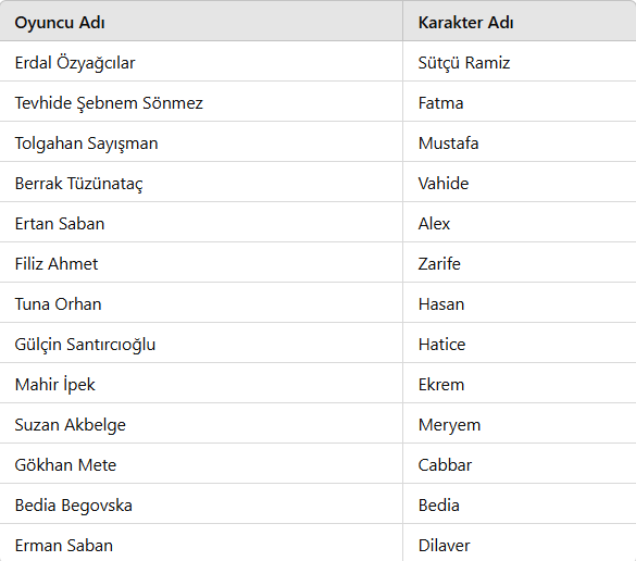 Dizi, dönemin tecrübeli oyuncularıyla genç isimleri bir araya getiren geniş bir kadroya sahiptir. Sütçü Ramiz karakteriyle Erdal Özyağcılar başrolde yer almıştır. Kadroda ayrıca Şebnem Sönmez, Gülçin Santırcıoğlu, Tolgahan Sayışman, Berrak Tüzünataç ve Ertan Saban gibi oyuncular bulunmaktadır. Oyuncu seçimi, dönemin ruhuna uygun karakterlerin oluşturulmasında etkili olmuştur.
