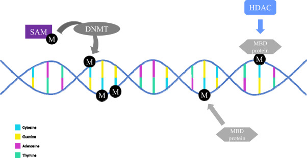 Epigenetic gene regulation in humans involves multiple mechanisms, including DNA methylation, which contributes to the tissue-specific regulation of gene expression. DNA methylation occurs at CpG dinucleotides and is catalyzed by DNA methyltransferases. CpG islands, particularly within promoter regions, are common targets. Approximately 70% of gene promoters are located in CpG islands, and methylation at these sites is associated with transcriptional repression. This repression occurs via recruitment of methyl-binding proteins and chromatin-remodeling complexes, which condense chromatin and hinder transcription factor access. In somatic cells, DNA methylation contributes to cellular differentiation by maintaining stable gene expression patterns. In cancer, abnormal DNA methylation patterns lead to hypermethylation of tumor suppressor genes and hypomethylation of oncogenes, contributing to carcinogenesis. For example, the tumor suppressor gene CDKN2A is frequently silenced by promoter hypermethylation.