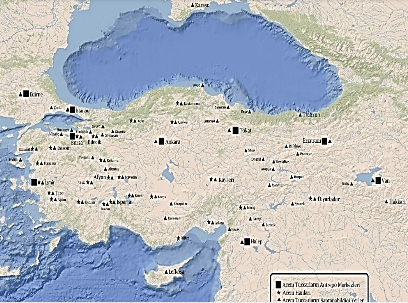 Erzurum’daki Taş Han (Rüstem Paşa Hanı) ve Gümrük Hanı, Acem tüccarlarının Doğu’dan gelen kervanlarla konakladığı temel mekânlardandır. Aynı şekilde, Samsun, Trabzon, Kırım-Karasu gibi görece uzak bölgelerde dahi Acem tüccarlarının yoğun olarak kaldığı hanlara dair kayıtlar bulunmaktadır. Bu hanlar, tüccarların mal güvenliği, haberleşme, ortaklık kurma ve yerel ağlara erişim açısından merkezi rol oynamıştır.
