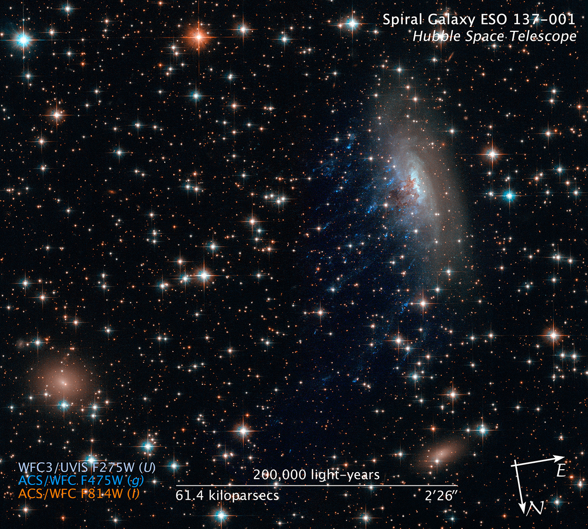 ESO 137-001 Galaksisi, Erboğa (Centaurus) takımyıldızında yer alan ve Norma kümesi (Abell 3627) içerisinde bulunan sarmal bir galaksidir. Bu galaksi, özellikle galaksi kümelerindeki çevresel etkileşimlerin gözlemlenebilmesi açısından kritik bir örnek teşkil etmektedir. ESO 137-001’in yüksek hızla kümeye doğru hareketi, galaksiyle etkileşimde bulunan ortam gazıyla (intra-küme ortamı) sürtünmeye bağlı olarak kuyruk yapıları oluşturmasına neden olmaktadır. Bu durum, hem gözlemsel astrofizik hem de galaksi evrimi bağlamında önemli bir araştırma alanı yaratmaktadır.