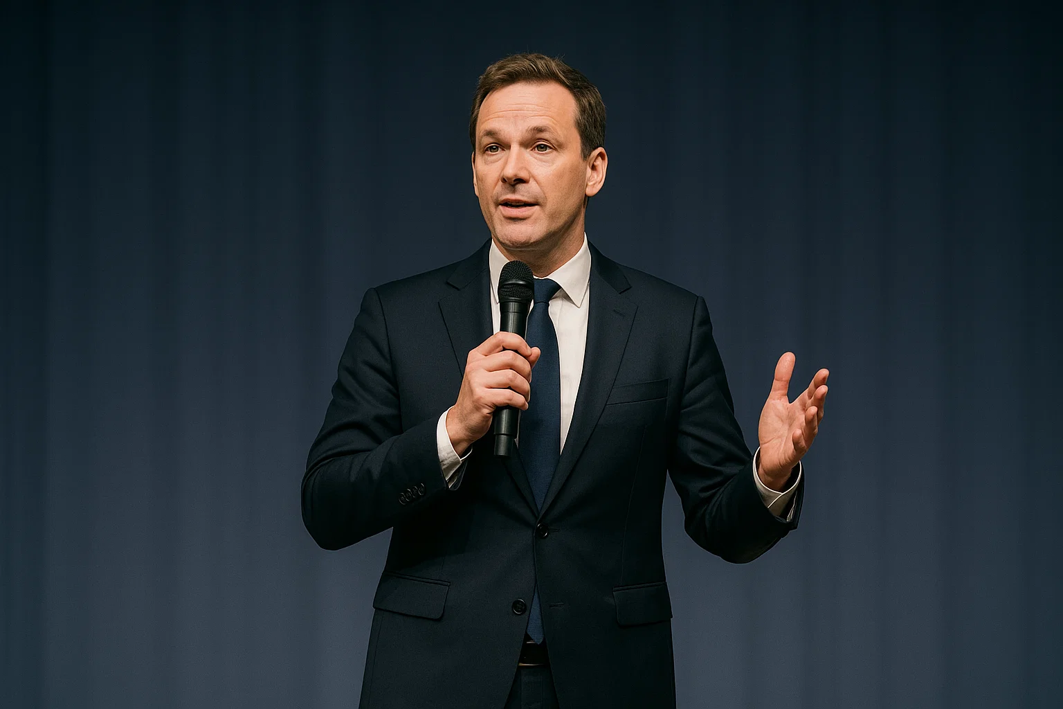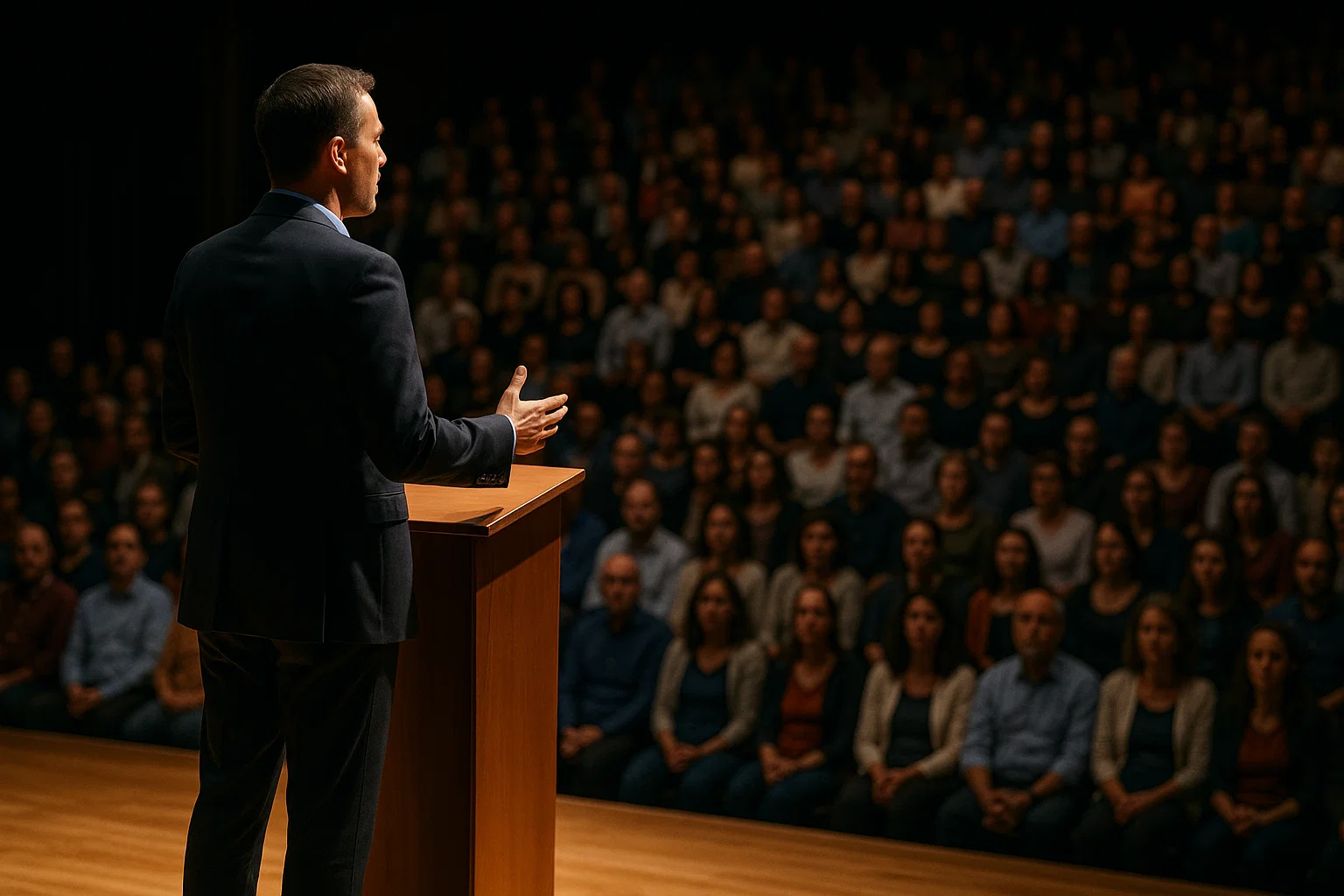 Sahnede Konuşma Yapan Bir Kişi (Yapay Zeka İle Üretilmiştir.)