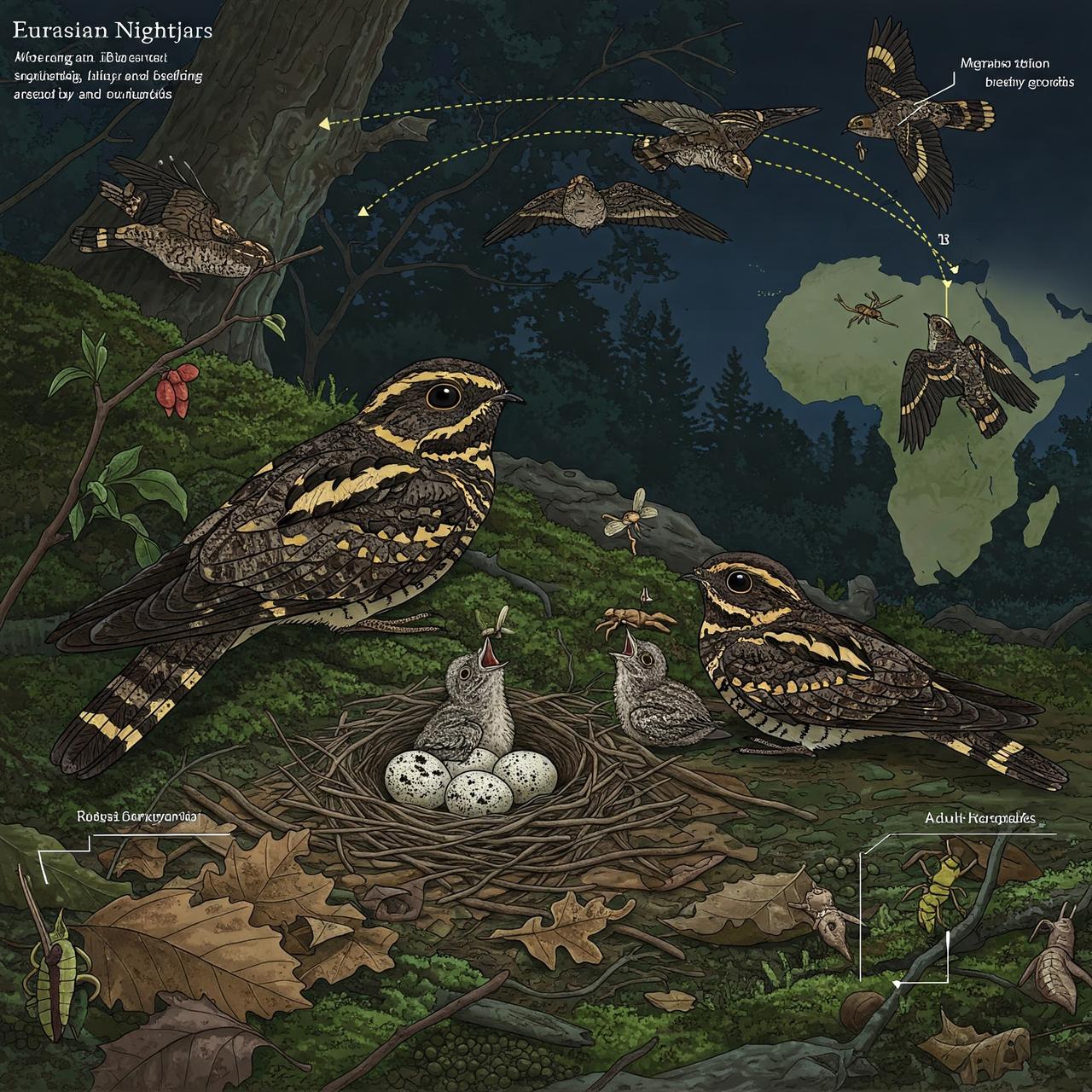 European Nightjar (Caprimulgus europaeus) is a nocturnal and long-distance migratory bird species belonging to the family Caprimulgidae. Breeding across a wide geographical area of Eurasia, this species spends the winter in sub-Saharan Africa. It is known for its silent flight, camouflage ability, and characteristic call. The European nightjar prefers open woodland areas, heathlands, scrublands, and grasslands. Scientific studies on its ecological requirements also help in understanding the threats the species faces.