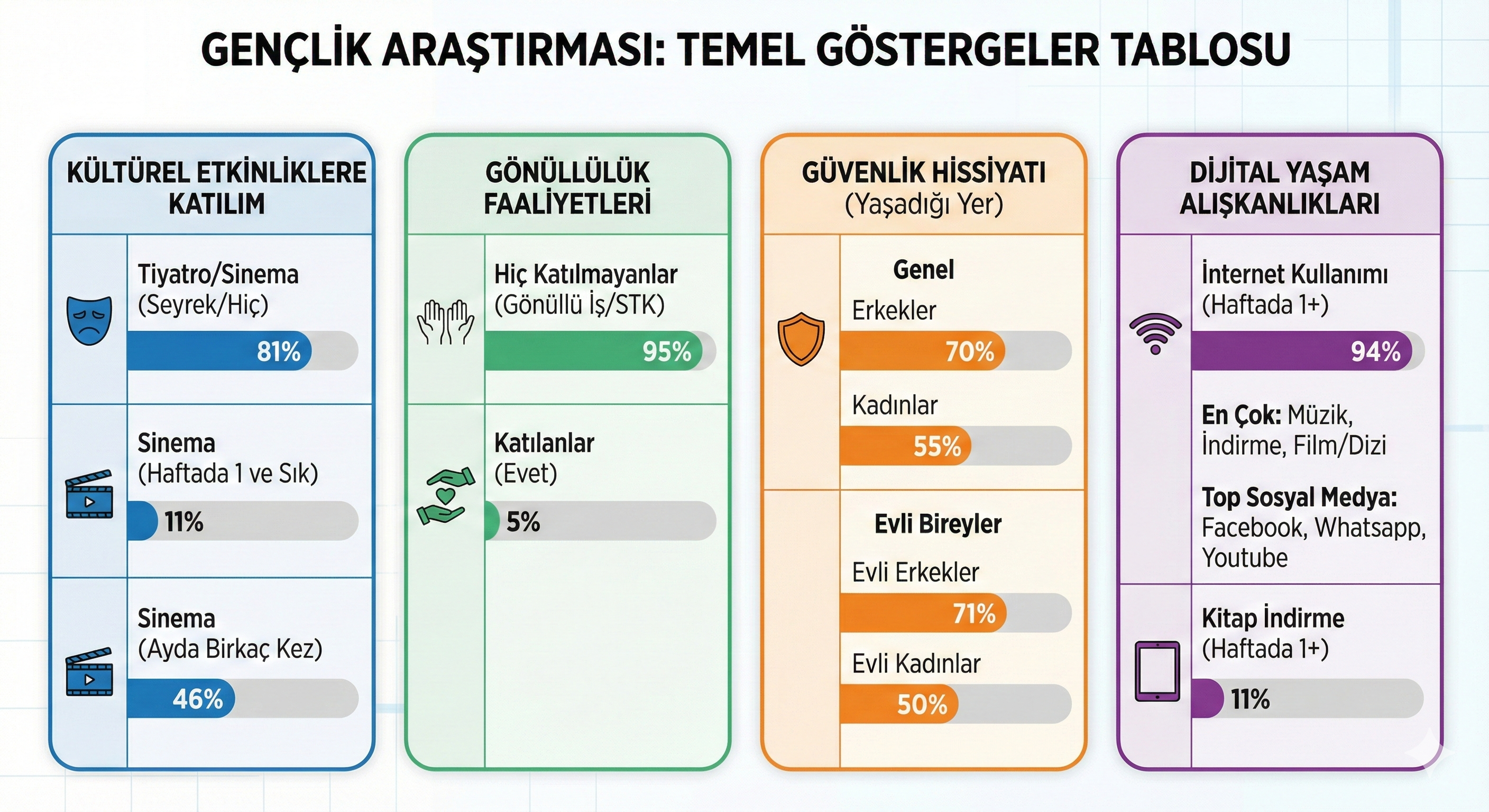 - Kültürel Etkinliklere Katılım: Gençlerin kültürel etkinliklere katılımı düşüktür; her 100 gençten 81'i tiyatro ve sinemaya "seyrek" veya "hiç gitmediğini" belirtmektedir. En sık yapılan kültürel aktivite sinemaya gitmek olarak rapor edilmiştir; katılımcıların %11'i haftada bir ve daha sık, %46'sı ise ayda birkaç kez sinemaya gitmektedir.【6】