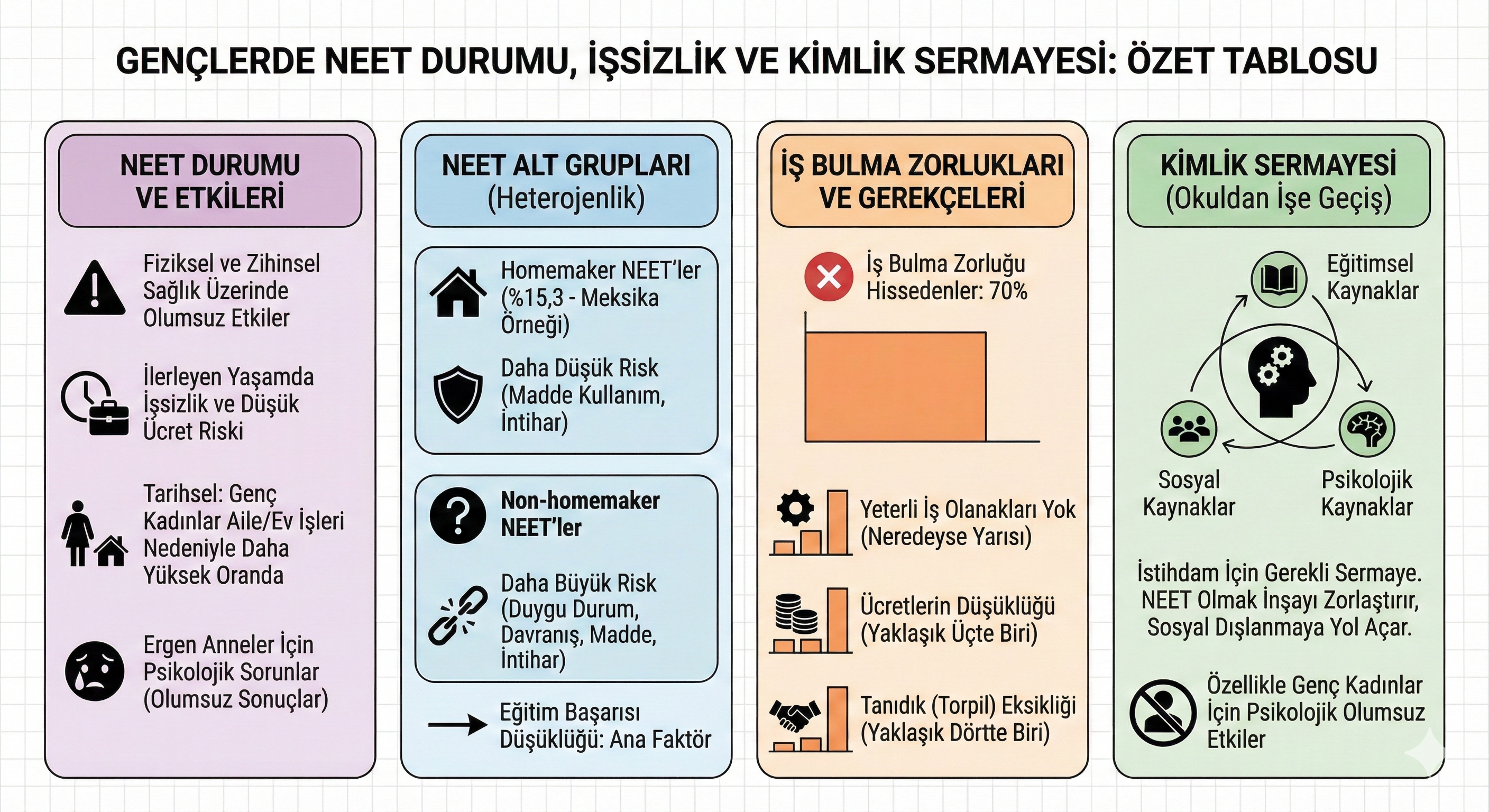 Gençlerde NEET Durumu, İşsizlik ve Kimlik Sermayesi: Özet Tablosu (Yapay Zeka ile Oluşturulmuştur.)