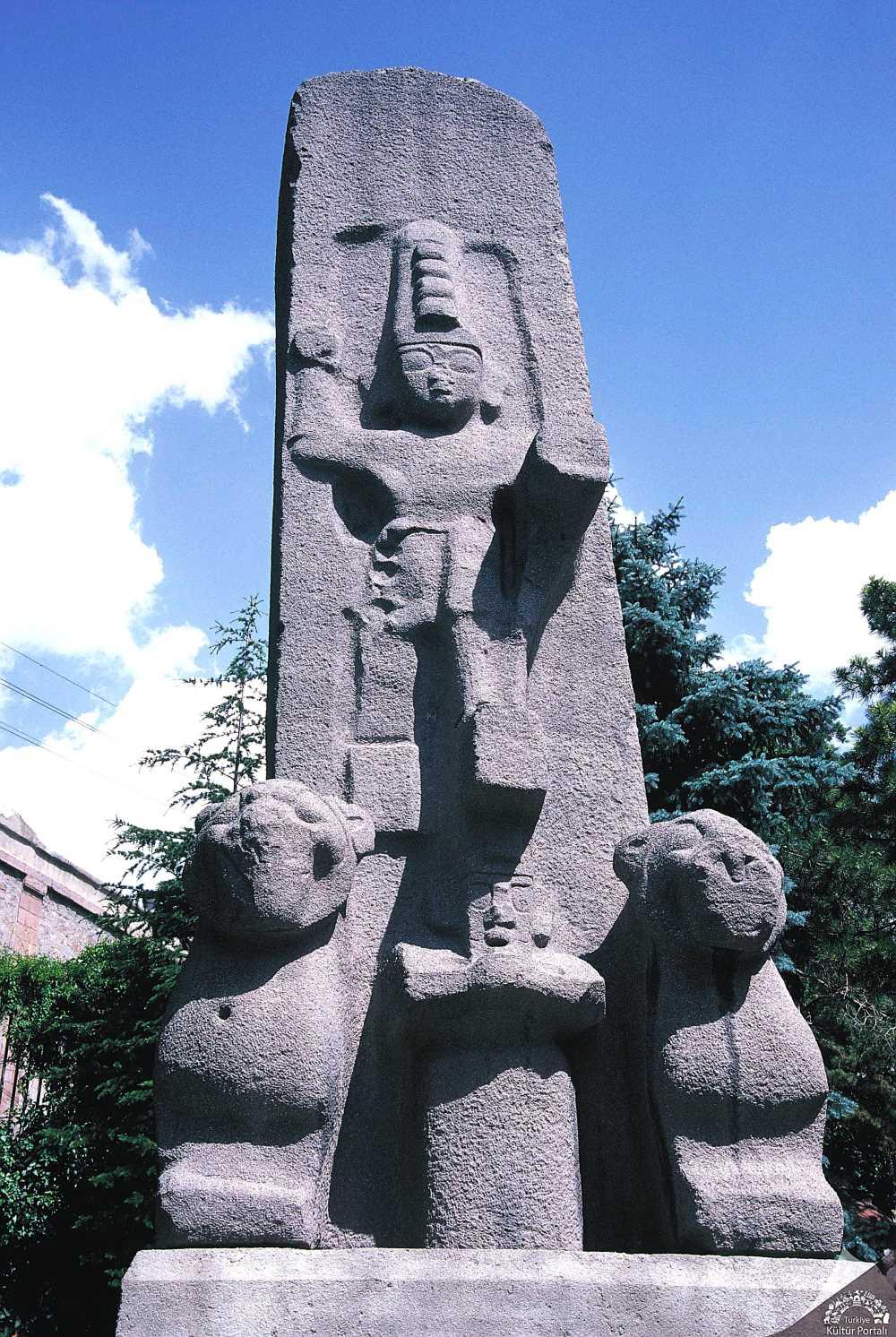 Anıtın üzerinde yüksek kabartma tekniği ile işlenmiş iki adet tanrı figürü bulunmaktadır. Kompozisyonun merkezinde yer alan baş tanrı figürü, bir ayağını aslanın üzerine, diğer ayağını ise dağ tanrısı üzerine basar vaziyette tasvir edilmiştir. Bu figürün bir elini havaya kaldırmış olduğu görülmektedir. Ana figürün hemen altında, daha küçük boyutlarda betimlenmiş ve bir dağ tanrısı olduğu değerlendirilen ikinci bir figür yer almaktadır.