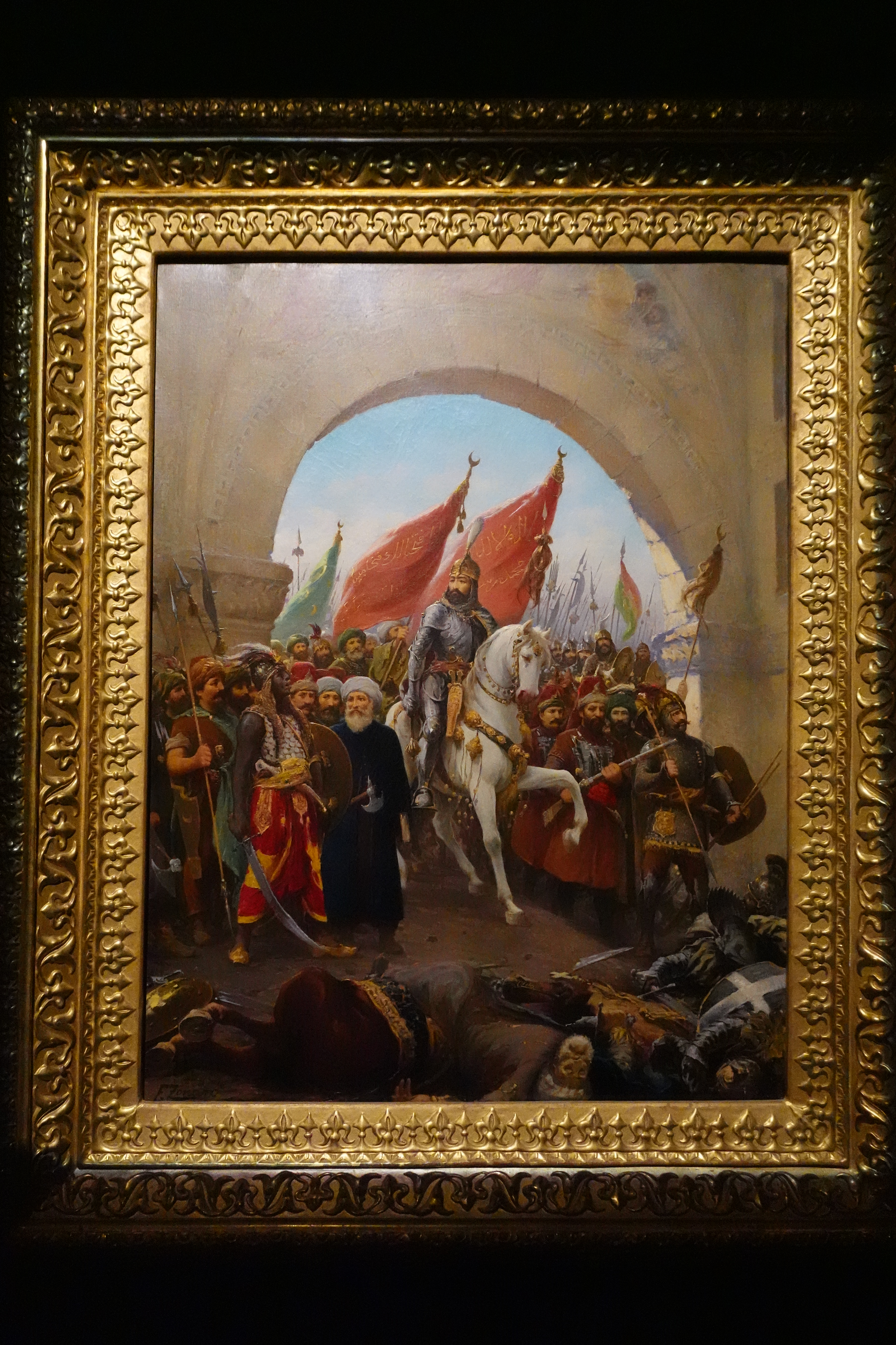 Zonaro’nun en bilinen tarihî konulu yapıtlarından biridir. 29 Mayıs 1453 tarihli İstanbul’un fethini betimleyen bu tablo, Fatih Sultan Mehmed’in at sırtında, Bizans başkentine görkemli ve kararlı bir biçimde girişini canlandırır. Kompozisyonda padişah, merkezî bir figür olarak konumlanırken; etrafındaki yeniçeriler, surlar ve halk kalabalığı dramatik bir atmosferle resmedilmiştir. Eser, II. Abdülhamid’in siparişiyle yapılmış ve Yıldız Sarayı koleksiyonuna dahil edilmiştir.